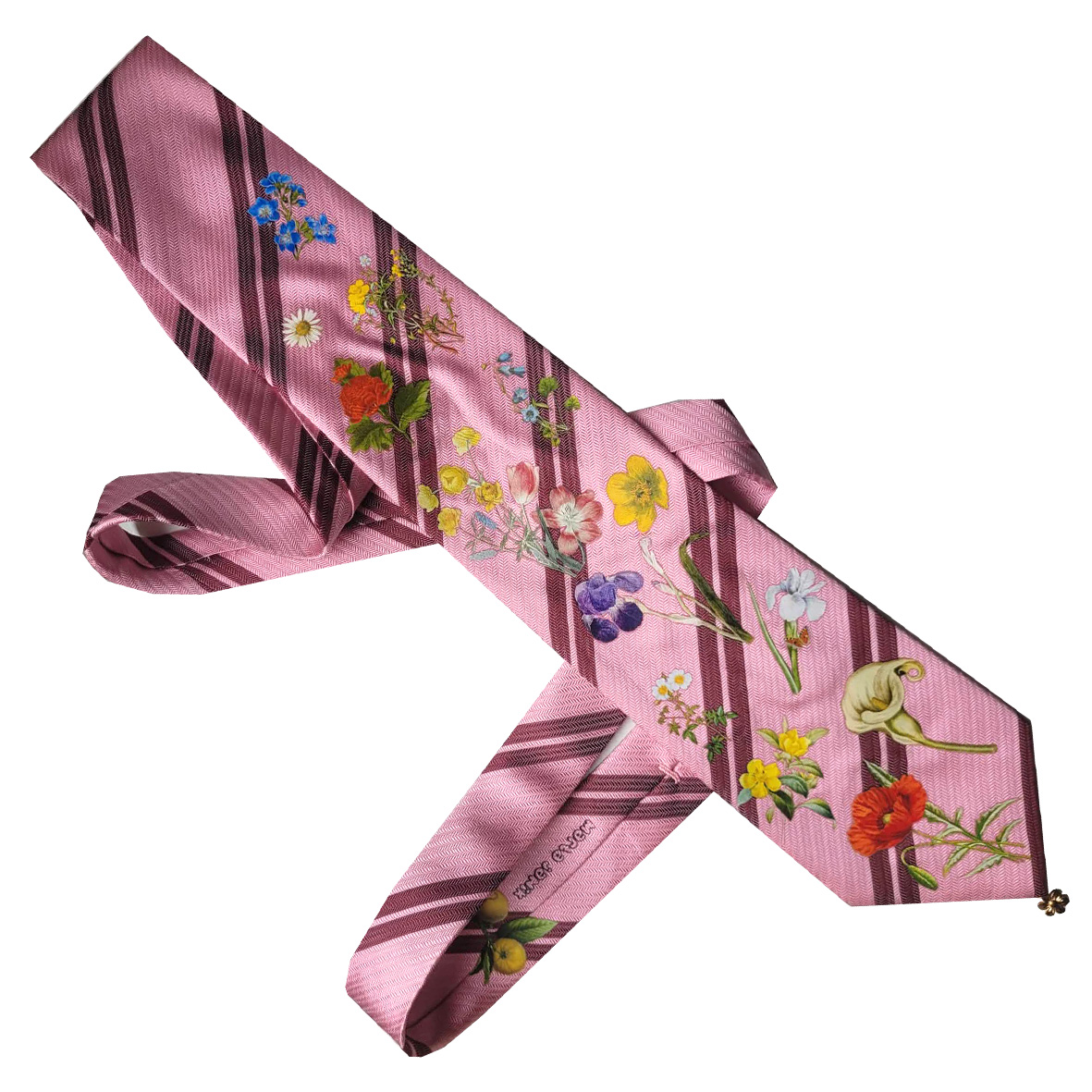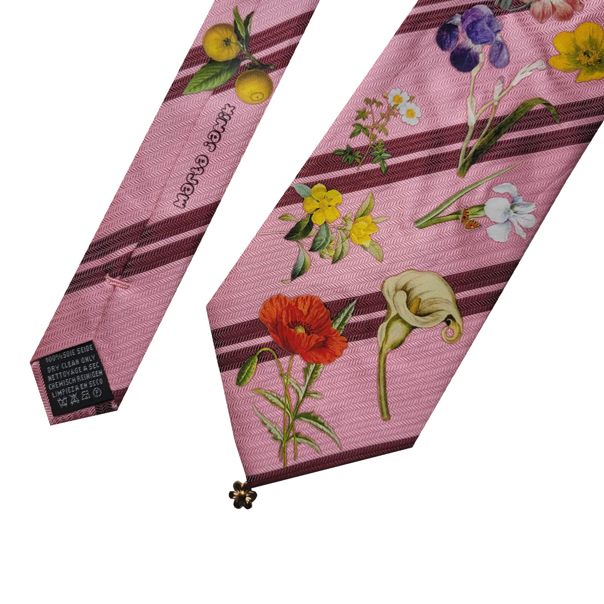 A tie with many flowers and a flower charm.