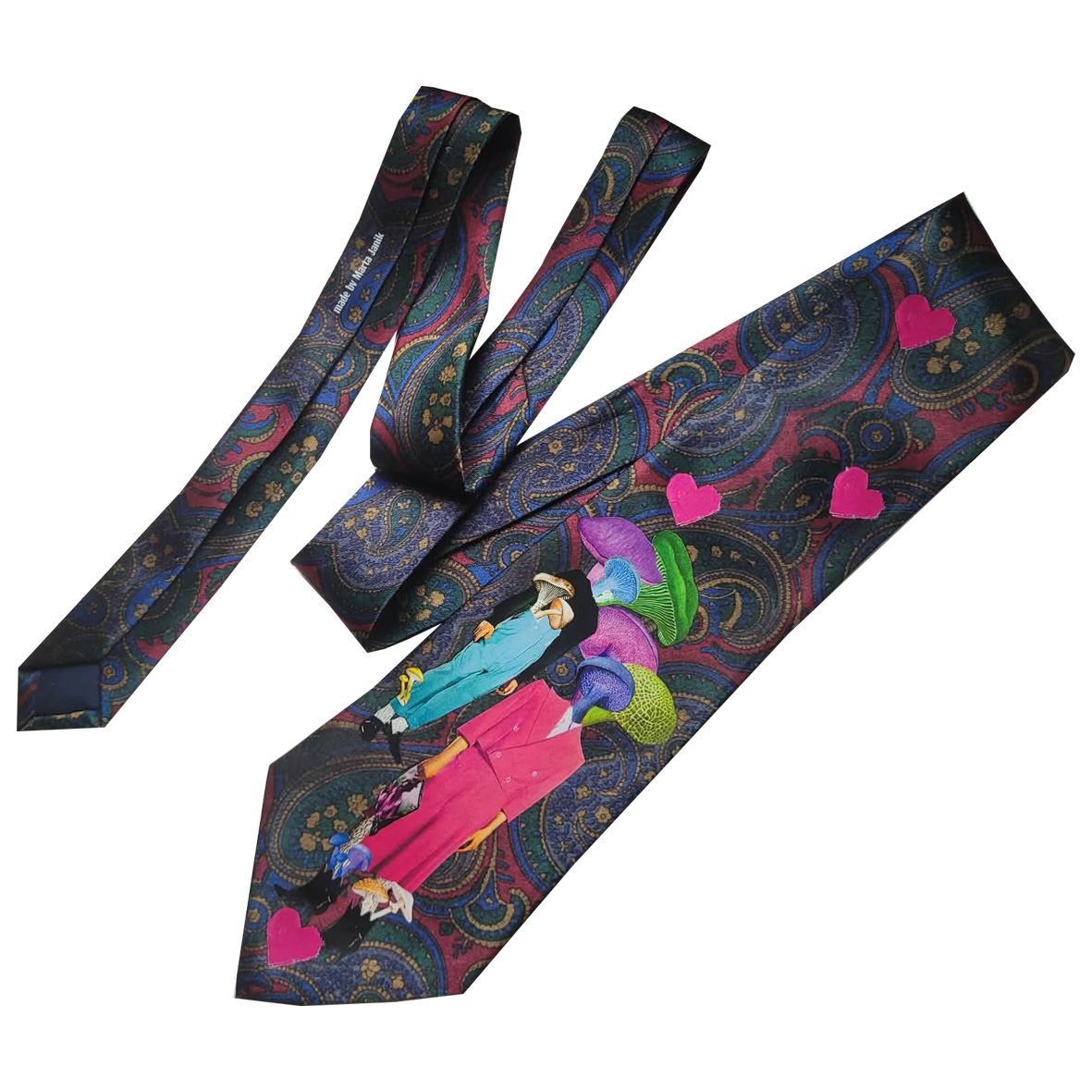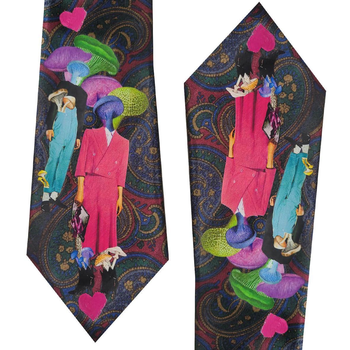 A beautiful, delicate tie with a mushroom collage design that feels lovely to the touch.